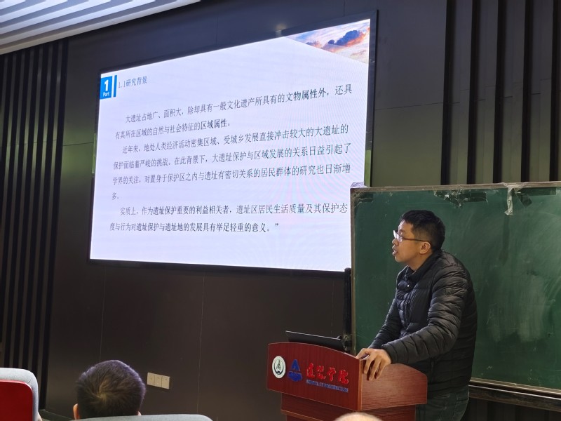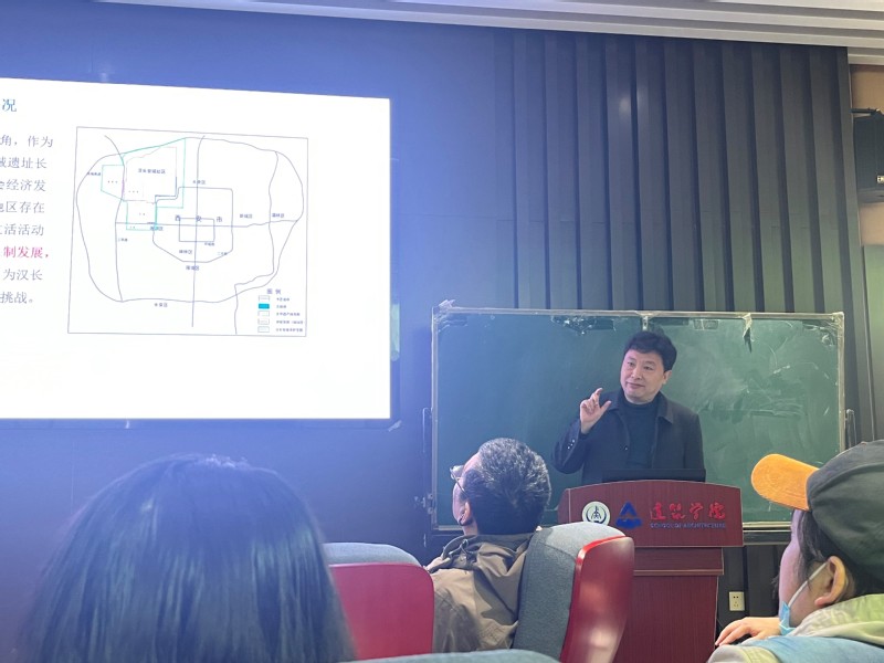 之后,由陈稳亮教授针对汉长安城遗址保护区的研究进行了成果分享,向同学们介绍了大遗址区的概况、汉长安城遗址区民生问题、空间维度视角下汉长安城遗址典型村落民生发展概况以及从“遗址保护与城市发展协同”和“遗址保护与乡村振兴协同”两方面提供了相关规划策略,为同学们开拓了设计研究思路。