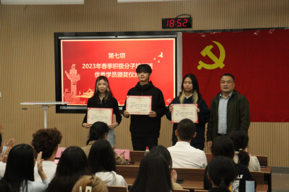 随后,二级党校班主任落昊飞老师介绍本次培训班授课及学员情况;学办主任洪诗迪老师宣读304永利集团二级党校考核及学习纪律规定,希望大家严格遵守党校纪律,顺利结业并获得优异成绩;培训班学员代表许倚萌同学发言,表达了她参加培训的态度和决心;李雨青带领2023年春季新发展党员重温入党誓词,慷慨激昂;2023年春季二级党校入党积极分子培训班优秀学员表彰仪式,李险峰老师为李佳玉、何环坤、施展三位优秀学员颁奖。