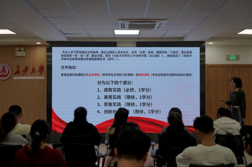 接着,为让23级团支书了解公司本科生课外实践课程的重要性并督促各班同学及时在“青春长大”系统上激活账号,青拓副主任贾沐馨详细介绍了“青春长大”首次登陆方法、分数等级设定和活动积分认证流程,并就在校生如何利用第二课堂提升自身综合素质,不断加强创新意识和实践能力进行了说明,鼓励同学们在校期间积极参与第二课堂的实践活动。