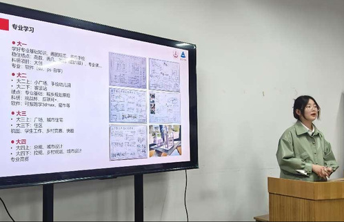 四支部党员刘楠同学从建筑学专业构成、大学规划、案例分析和学习建议四个角度开展座谈会。刘楠同学以崇明岛的城桥新城生态社区概念规划为案例进行分享,培养同学们的城区宏观规划思路。同时,刘楠同学还为大家介绍了大学大型竞赛时间及流程,为同学们的专业学习指明方向。最后,刘楠同学分享自己常用的专业公众号和制图软件资源,帮助同学们高效学习、掌握专业软件。
