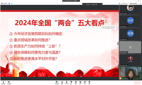 随后,会议进入了学习交流环节,同学们结合自己的学习和生活实际,就如何践行两会精神进行表态发言。