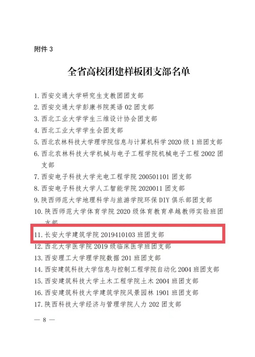 近日,共青团陕西省委、中共陕西省委教育工委印发《关于全省学校团建示范培育结果的通报》,公司2019410103班团支部被认定为“全省高校团建样板团支部”。
