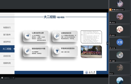 首先,陈高扬学长为同学们介绍了期末考试建议,并强调了诚信应考、杜绝作弊的重要性。陈高扬、邢锐然为同学们分享了暑期规划建议,包括专业书籍阅读、软件学习应用以及社会实践等,希望学弟学弟能够在度过一个充实、安全、有意义的假期。