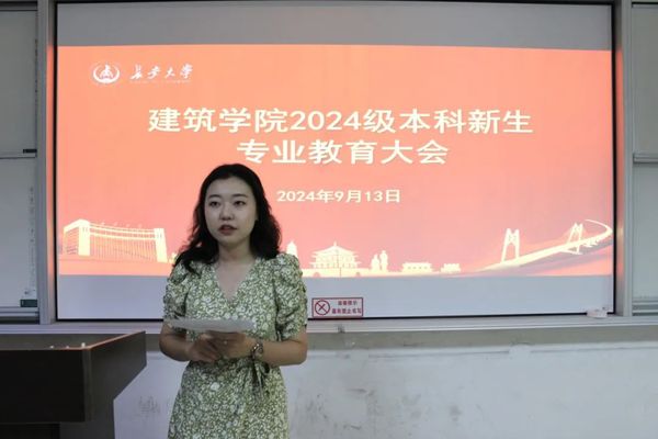 许昕老师从熟悉的建筑物入手,引出建筑学专业概念,并进行深入介绍。同时结合当前AI融入生活的发展趋势,鼓励同学们做好迎接学科智能化、数字化的准备。随后她向新生详细介绍了建筑学专业的培养方案与特色发展模式,希望同学们能够打破学科壁垒,加强交流与合作,为建筑学的团队建设添砖加瓦,贡献自己的力量。